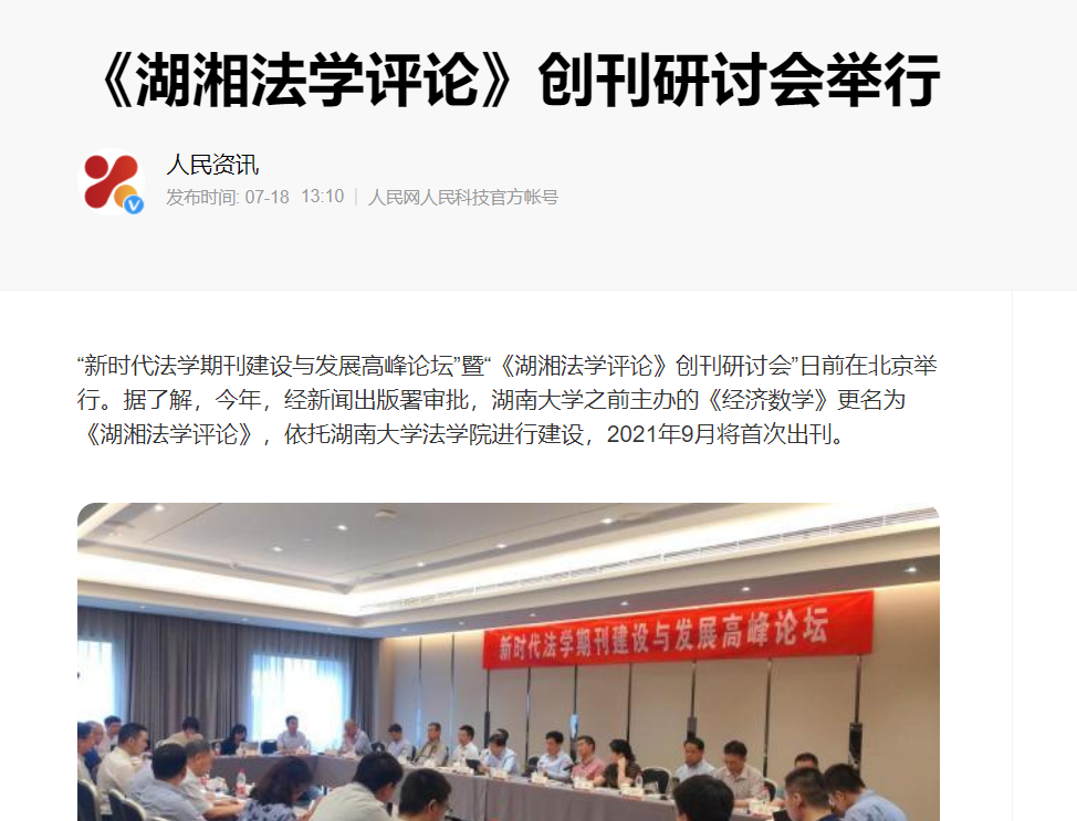 主办的“新时代法学期刊建设与发展高峰论坛”暨“《湖湘法学评论》创刊研讨会”在北京友谊宾馆举行。《湖湘法学评论》的成功创刊及研讨会的成功举办引发媒体密集报道。目前,已有《光明日报》、人民网-人民资讯、中国新闻网、法治日报—法制网、检察日报-正义网、《法治周末报》、凤凰网、《法制周报》、新湖南客户端、《三湘都市报》、红网、《长沙晚报》、腾讯网、华声在线等为此推出报道,《中国法学》杂志社公众号、教授加、法学学术前沿、法科生之家、法研在线等知名法律界公号推出了详细报道。