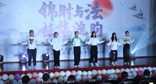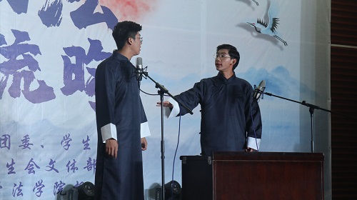 舞台剧《大学老师茶话会》展现出大学辅导员在同学们学习、生活、人际交往等方面的无私奉献,法学1901班同学用生动活泼的表演形式表达对辅导员老师的理解与尊敬,号召同学们在大学期间努力学习、积极进取。赵行、刘睿涵同学带来的乐器合奏《天空之城》让观众徜徉在美妙的音乐世界,感受跳动的音符带来的愉悦与静谧,收获了现场观众持久不息的热烈掌声。法学1903班同学献上歌曲《年少有你》,致敬洋溢激情与甜蜜的青春韶华。法学1904班同学带来的舞台剧《对龙谈法》体现对环境保护与经济发展之间关系的思考,并且融入环境保护法等法学知识,表现动漫色情片