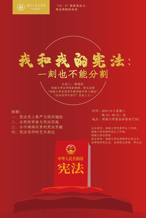 讲座主要围绕“宪法的至上尊严与现实尴尬、合宪性审查与宪法实施、宪法信仰的艺术表达及古今湖湘名贤的宪法贡献”四个方面展开,全面系统地梳理宪法的发展历程及现状。