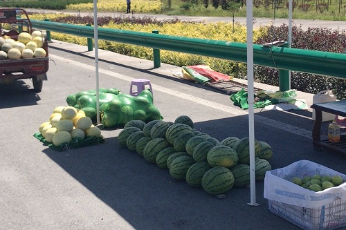在王阿姨的带领下,任致璇来到西瓜零售处,帮助村民售卖西瓜。此时正值旅游旺季,该售卖地处于环西线车辆必经之地。为吸引游客,村民同时批发售卖多种水果,包括哈密瓜、郁金香甜瓜、枣酥梨等。据了解,该处村民每日西瓜营业额在700-1000元之间。