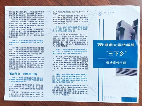 编写的“三下乡”普法宣传手册,其内容主要涉及在疫情期间可能碰到的法律问题。通过之前的调研及村主任的介绍,了解到大部分村民的法律意识比较淡薄。在生产生活中遇到一些纠纷时,可能不会把法律武器作为维护自己合法权益的首选工具,而依然选择一些个人的解决方法。因此,为达到更好的宣传效果,任致璇结合经典案例以及村民在生产生活中常见的案例,用通俗易懂的语言以案说法,让村民们轻松懂法。同时她也介绍了一些常见的维权渠道,提高村民的维权意识,提醒他们在自身权益遭受侵害的时候,及时运用法律武器保护自己。