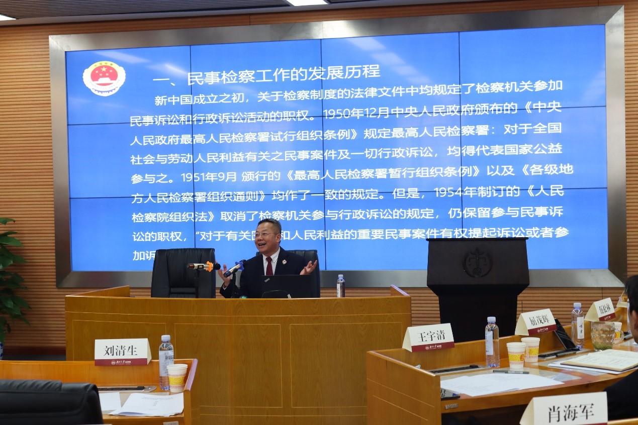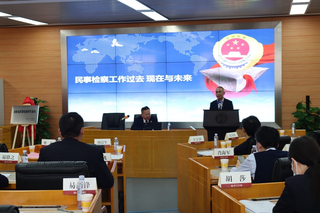 授牌仪式结束后,湖南省民事检察研究基地进行了第一次交流研讨。刘清生副检察长作了题为“民事检察工作的过去、现在与未来”的主题报告。