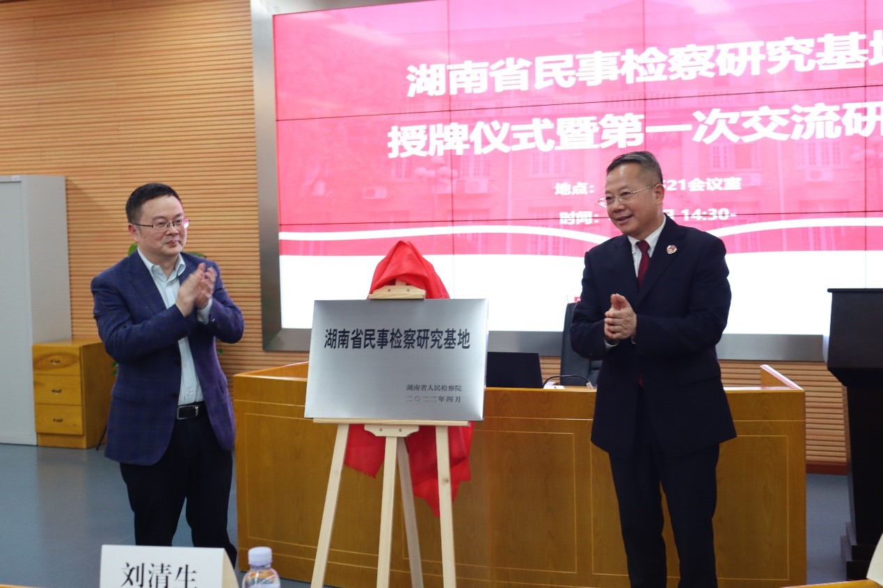 在热烈的掌声中,刘清生副检察长和谢赤副校长共同为“湖南省民事检察研究基地”揭牌。