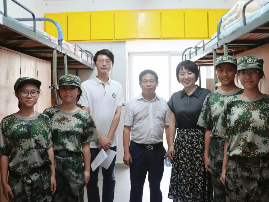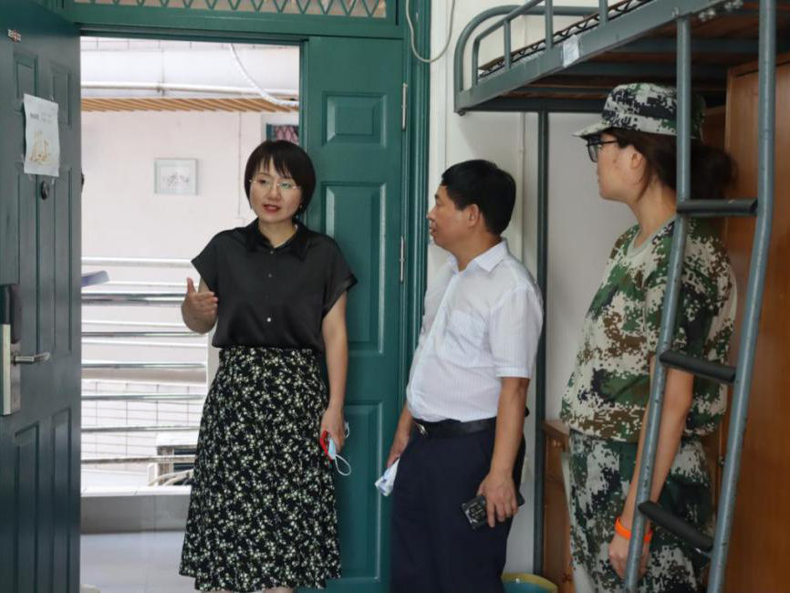 “同学们好!这几天的军训生活还习惯吗?”在新生宿舍,易书记亲切地询问学生们的基本情况、对新环境的适应情况以及一周以来的军训感受。他嘱咐新生们注意宿舍卫生与个人安全问题,并鼓励大家要尽快适应大学生活,在军训期间也应抓紧时间学习,早日进入学习状态。
