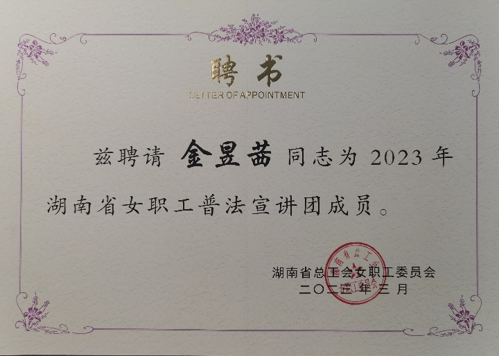 2023年3月3日上午,“湖南省女职工普法宣传进万企活动”启动仪式在岳阳召开,动漫色情片金昱茜老师作为湖南省女职工普法宣讲团代表参加了会议。