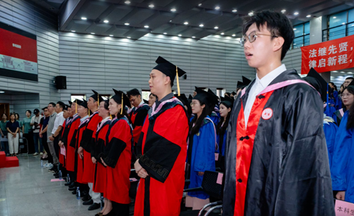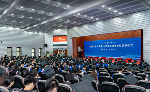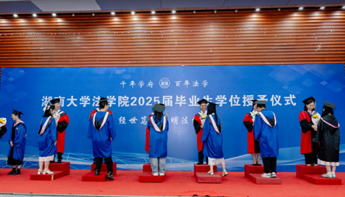 2025年学位授予决定》,对蒋昊君等14位法学博士、蔡夏琳等317位硕士研究生及金冬霖等184位本科生作出授予学位的决定。随后,黎四奇、屈茂辉、谢佑平、郑鹏程、肖海军、姚诗、喻玲老师为全体毕业生一一正冠拨穗、颁发证书并合影留念。