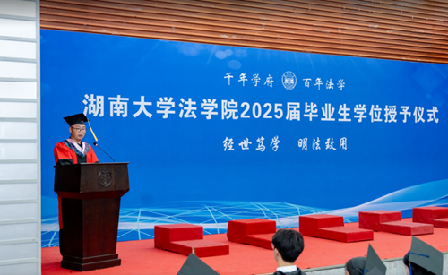 学位授予仪式上,院长黎四奇教授以 “尽量做一个会独立思考的人” 为题发表毕业致辞。在毕业季心灵鸡汤泛滥之际,独立思考作为 “人” 的本质属性更需被重视。他从法律研习中 “人” 的概念切入,结合笛卡尔 “我思故我在”、帕斯卡尔 “会思考的苇草” 等哲思,强调数智时代算法通过 “个性化推荐” 打造的电子信息茧房正威胁个体认知独立,人若沦为资本与技术的奴隶,便失去了 “人” 的本质。他进而提出独立思考的实践路径:学会独处以在孤独中磨砺意志、回归自我,坚持阅读以书籍滋养灵魂、构建精神家园,保有 “适度不知情权” 以拒绝碎片化信息侵蚀、守护理性思辨。此外,他援引托尔斯泰、约翰・多恩等思想家的观点,强调独立思考不仅是对自我存在的确证,更是对他人与社会的责任担当,法律人需以仁爱之心践行 “诚实生活、不加害他人” 的理念,在信息洪流中通过独立思考确证 “人” 的尊严,既成为自己灵魂的主宰,也成为照亮世界的微光。最后,院长以罗曼・罗兰的名言作结:“在数智洪流中做独立思考的人,是认清生活真相后的英雄主义。” 愿诸君以书籍为舟、以思辨为桨,在信息迷雾中坚守理性之光,既做自我灵魂的掌舵者,亦做照亮他人的提灯人。如此,方不负 “法律人” 的初心,方不辱 “独立思考者” 的担当。