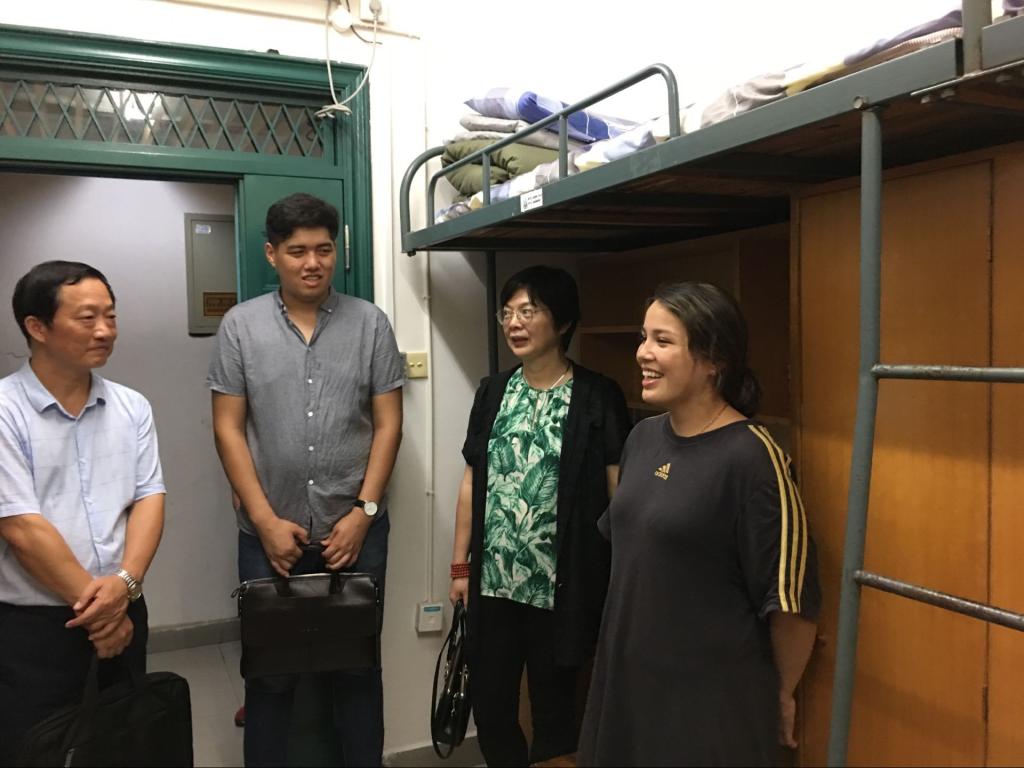 (院党委书记李连友、党委副书记、副院长付蓉芬在2018级本科生辅导员王浩陪同下前往新生寝室)