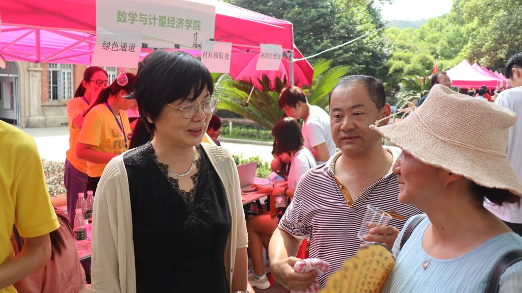 (学院党委副书记、副院长付蓉芬也来到东方红广场,同新生家长亲切交谈)