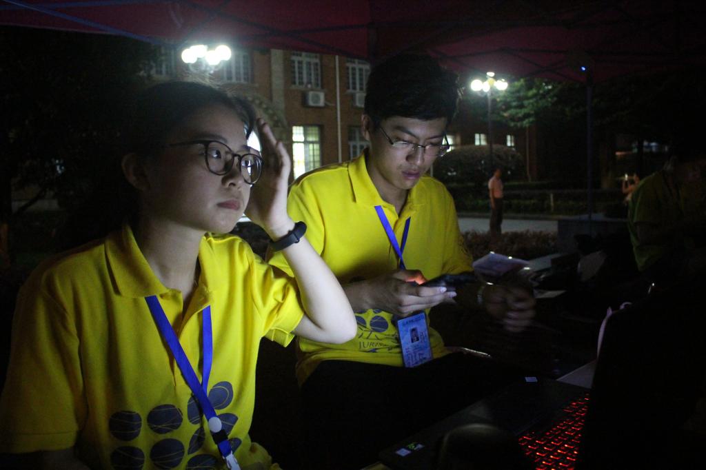(凌晨时分,迎新团队成员在迎新总站等待新生到来)