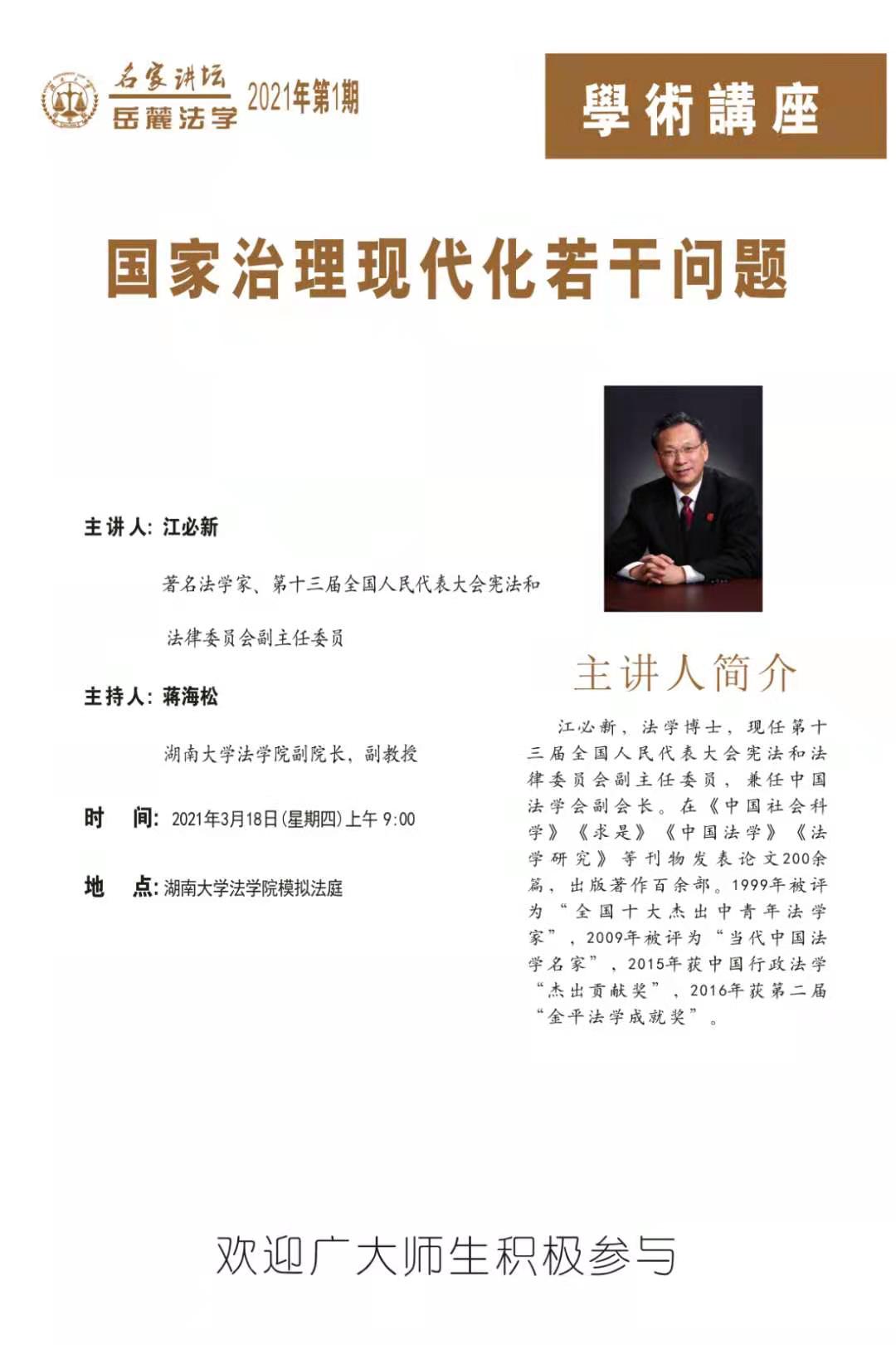 主讲人:江必新(著名法学家、第十三届全国人民代表大会宪法和法律委员会副主任委员)