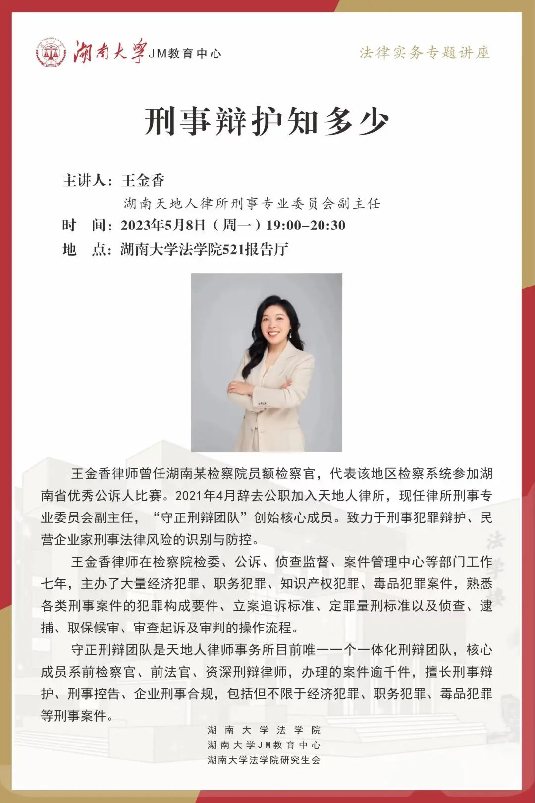 近期,中共中央办公厅、国务院办公厅印发《关于加强新时代法学教育和法学理论研究的意见》(以下简称《意见》),《意见》指出法学教育和法学理论研究承担着为法治中国建设培养高素质法治人才、提供科学理论支撑的光荣使命,在推进全面依法治国中具有重要地位和作用。为切实贯彻落实《意见》精神,学院将与各实践单位合作开展法律实务系列讲座。本次JM实务讲座将由湖南天地人律所的王金香律师为大家分享刑辩律师的实务经验。对想了解刑事辩护执业经验的同学来说,这将是一堂极具干货的实务课,快来积极参与吧!