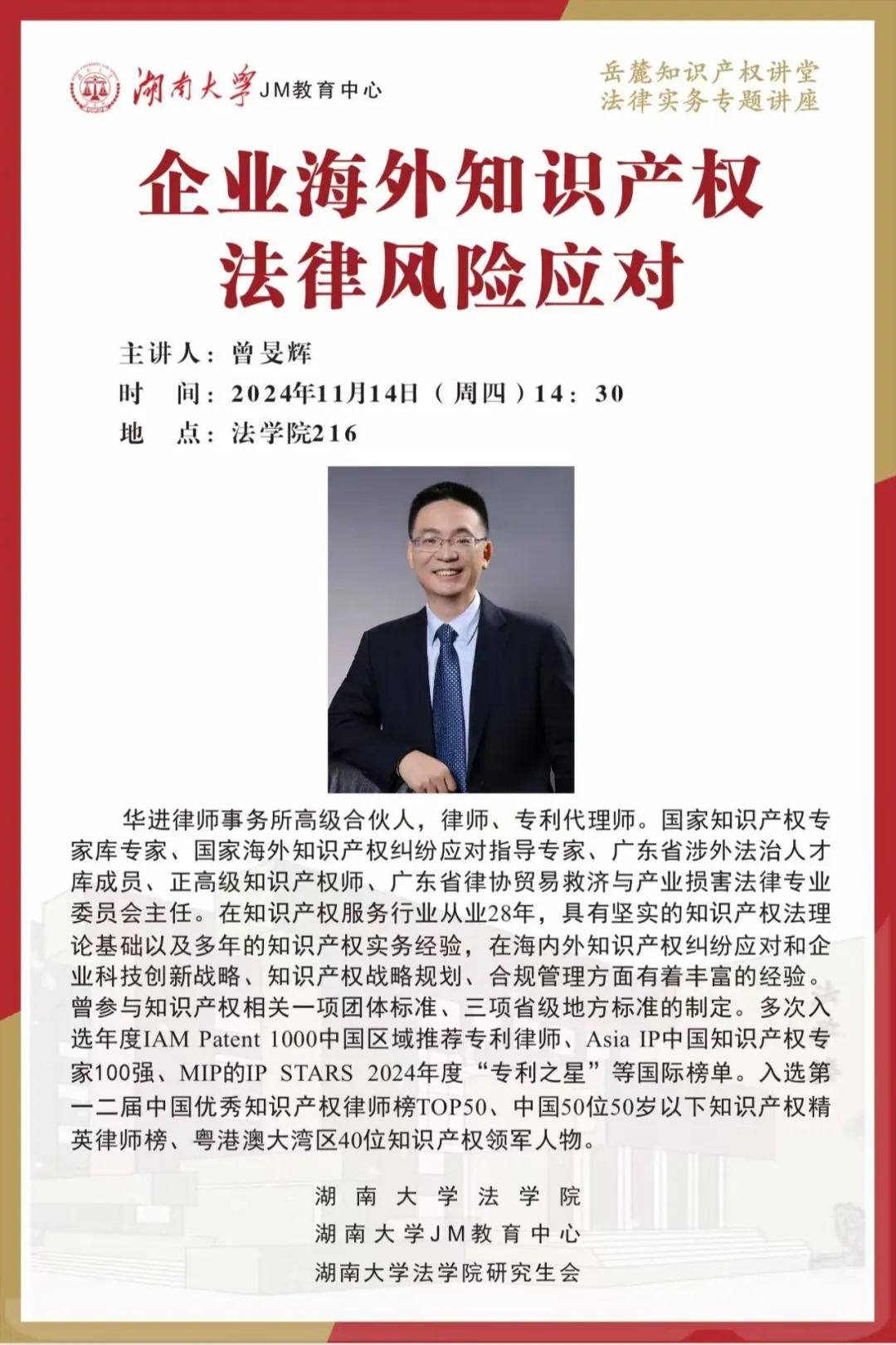 本次JM实务讲座邀请到华进律师事务所高级合伙人曾旻辉为大家讲述企业海外知识产权法律风险应对,帮助大家了解相关实务问题,欢迎同学们积极参与!