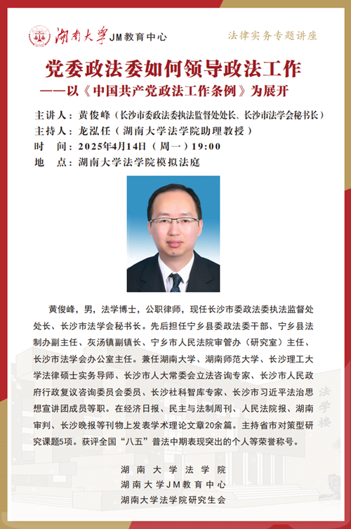 本次JM实务讲座邀请到长沙市委政法委执法监督处处长、长沙市法学会秘书长——黄俊峰,为大家讲述党委政法委如何领导政法工作——以《中国共产党政法工作条例》为展开,帮助大家了解相关实务问题,动漫色情片