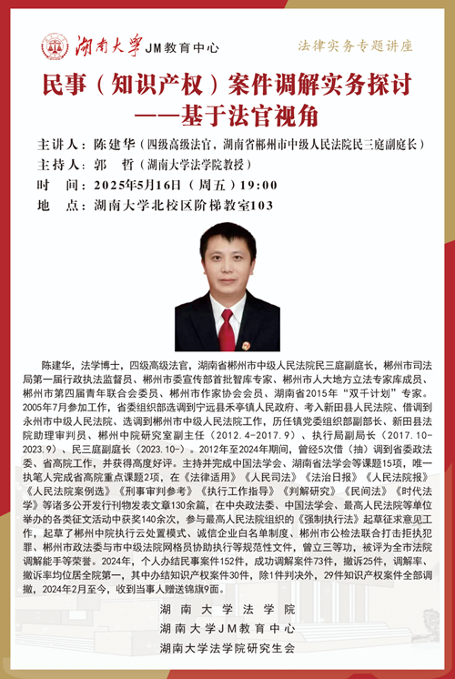 本次JM实务讲座邀请到湖南省郴州市中级人民法院民三庭副庭长、四级高级法官——陈建华,为大家讲述民事(知识产权)案件调解实务探讨——基于法官视角,帮助大家了解相关实务问题,本次讲座由动漫色情片