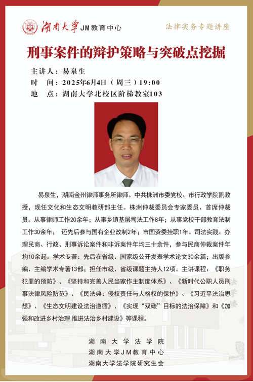 本次JM实务讲座邀请到湖南金州律师事务所律师,中共株洲市委党校、市行政学院易泉生副教授,为大家讲述刑事案件的辩护策略与突破点挖掘,帮助大家了解相关实务问题,欢迎同学们积极参与!