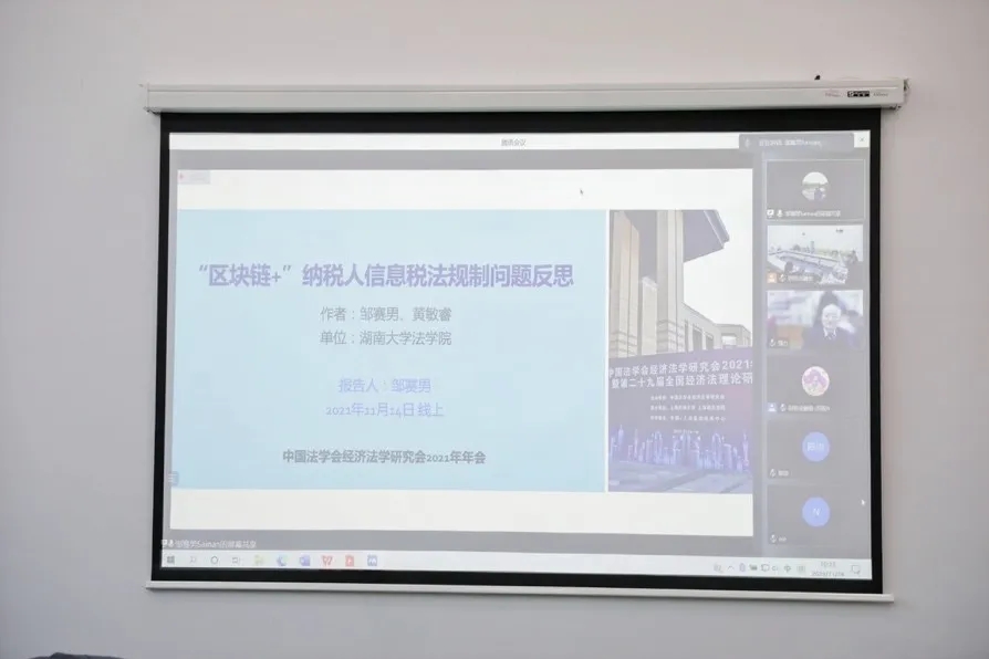 金福海教授共同主持了“第三分会场竞争法组”第一单元的线上会议(腾讯会议号:181182558)。邹赛男老师在“第二分会场财税金融组”第一单元的线上会议(腾讯会议号:299882633)作题为“‘区块链+’纳税人信息税法规制问题反思”的主题发言,华东政法大学陈少英教授、中南大学刘继虎教授、浙江大学谭立教授、北京工业大学聂孝红副教授等学者对发言进行点评。