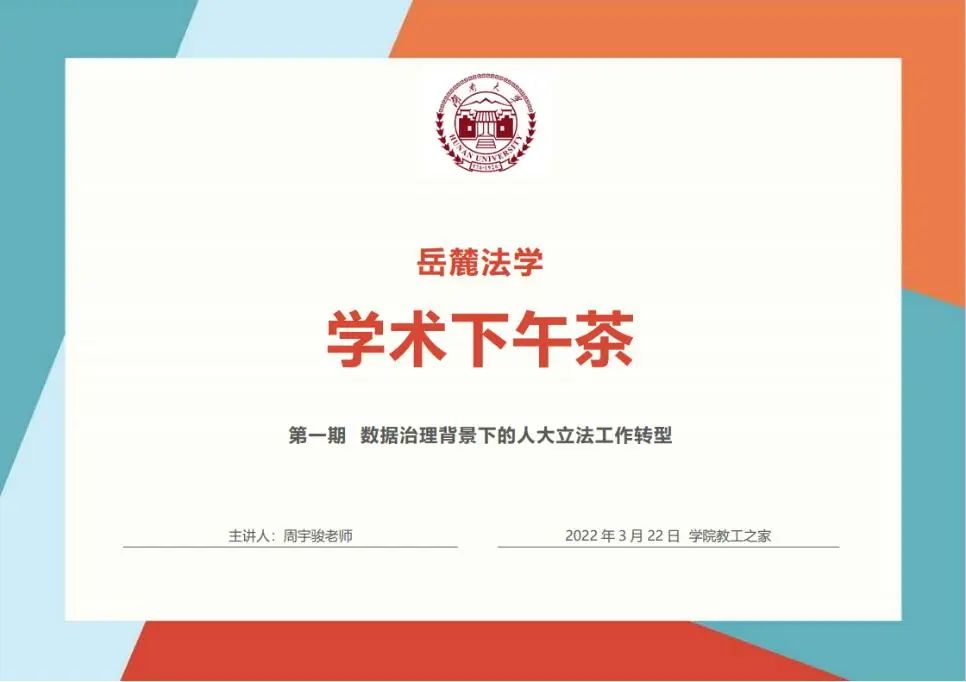 首期学术下午茶聚焦“数据治理背景下的人大立法工作转型”,由周宇骏老师主题分享,王静老师主持交流环节,学院20余名教师报名参加本次活动。