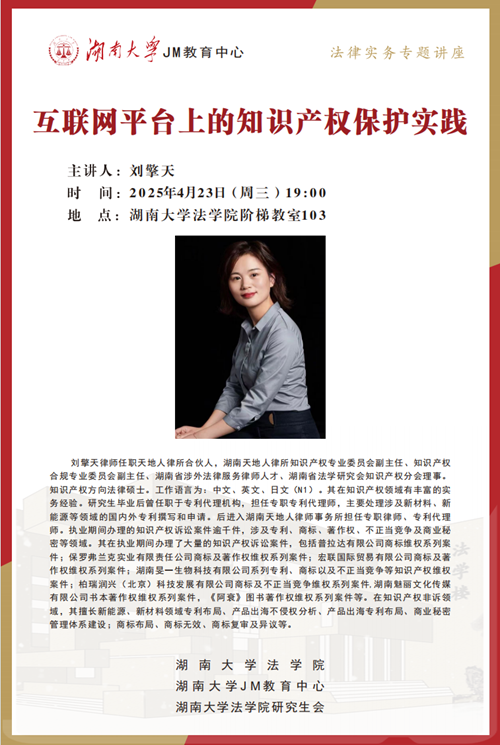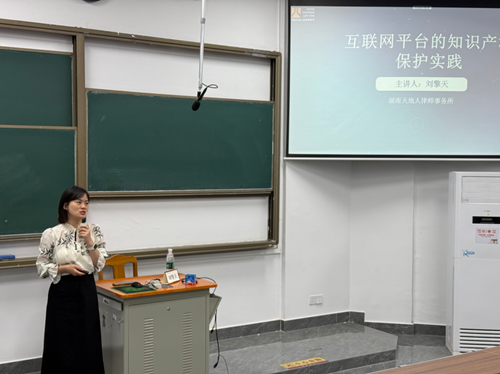 北校区阶梯教室103展开讲座。刘擎天律师任职天地人律所合伙人,湖南天地人律所知识产权专业委员会副主任、知识产权合规专业委员会副主任、湖南省涉外法律服务律师人才、湖南省法学研究会知识产权分会理事。知识产权方向法律硕士。工作语言为:中文、英文、日文(N1)。其在知识产权领域有丰富的实务经验。研究生毕业后曾任职于专利代理机构,担任专职专利代理师,主要处理涉及新材料、新能源等领域的国内外专利撰写和申请。后进入湖南天地人律师事务所担任专职律师、专利代理师。执业期间办理的知识产权诉讼案件逾千件,涉及专利、商标、著作权、不正当竞争及商业秘密等领域。动漫色情片