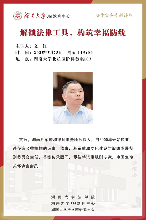 北校区阶梯教室103展开讲座。文钰律师现任湖南湘军麓和律师事务所合伙人,自2000年开始执业,系多家公益机构的理事、监事,湘军麓和文化建设与战略发展规则委员会主任,善家传承顾问,罗伯特议事规则专家,中国生命关怀协会会员。动漫色情片