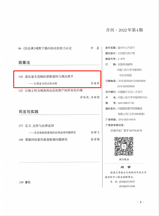 肖海军教授发表于《湖湘法学评论》创刊号(2021年第1期)学术论文《商法基本范畴的逻辑建构与理论展开——以营业为切点的分析》被中国人民大学书报资料中心复印报刊资料《民商法学》2022年第4期全文转载,这也体现了《湖湘法学评论》办刊水平进一步获得学界认同,取得显著进步。