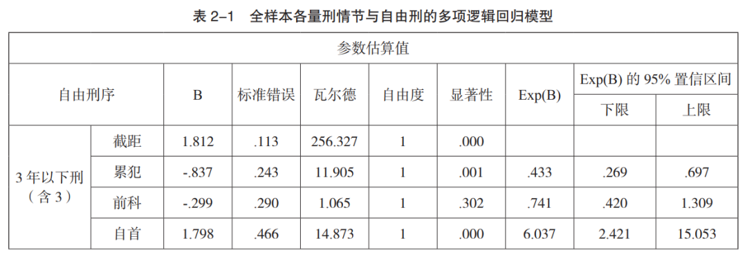 根据量刑指导意见,自首的基本从宽幅度为 0~40%,坦白为 0~20%,当庭认罪为 0~10%,认罪认罚为 0~40%,累犯为 10%~40%,前科为 0~10%。考虑到认罪认罚吸收自首、坦白等从宽情节而导致从宽幅度增大概率较高,各量刑情节影响力大小(不分正负)的应然序列为:认罪认罚 >自首 > 累犯 > 坦白 > 当庭认罪 = 前科。在上述模型中,EXP(β)回归系数,即 OR 值的大小反映了该情节的作用力大小,根据模型,量刑情节的实然价值序列为:在 3 年以下宣告刑中,认罪认罚 > 当庭认罪 > 自首 > 坦白 > 累犯;在 3 年以上 7 年以下宣告刑中,则认罪认罚 > 坦白。实然与应然对比,表明累犯的实际从严幅度不够,当庭认罪的实际从宽幅度过大,其余情节的裁量幅度较合理。