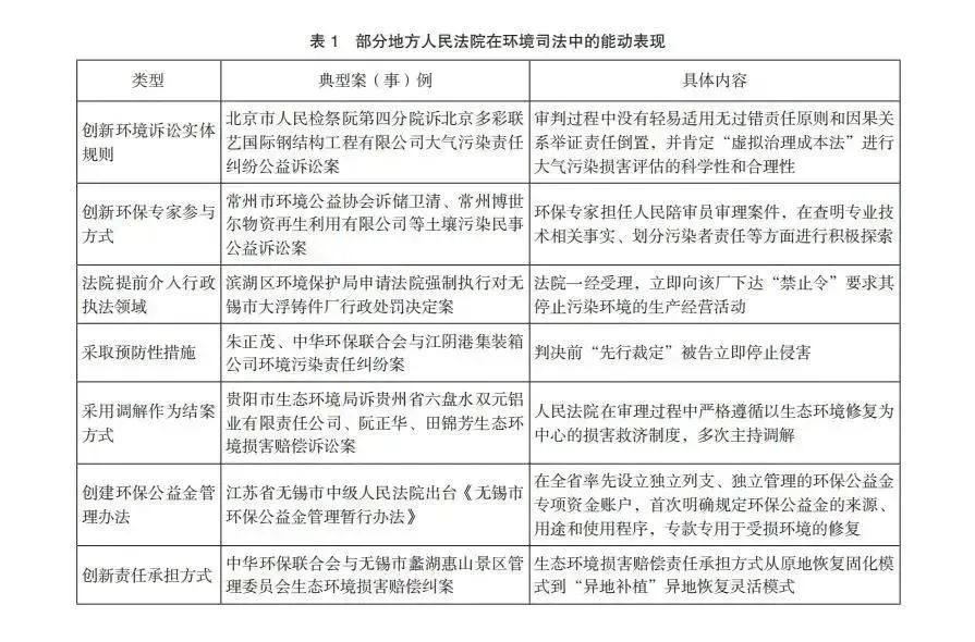 国外环境司法较其他司法领域在能动性上的表现更具积极性和广泛性。布拉德利 • 坎农曾提出法官“运用实质推理、使用实质价值性修辞、通过判决之外的补充意见”等 17 个参数描述司法能动主义的具体形式。各国环境司法能动呈现出多种表现形式和复杂维度:(1)在公共政策形成与立法方面,日本通过司法控制政治继而改变法律使公共利益得到长久的根本性维护。(2)环境案件管辖打破地区分割式传统方式,而代之以水、空气等环境要素自然属性与生态系统特性的跨区域管辖。美国、澳大利亚、新西兰、瑞典、日本、南非、孟加拉国、印度、科威特、肯尼亚等国家均已通过成立环保法院或设立环保法庭的方式实现环境审判灵活与效率的统一,美国“佛蒙特州环境法院”设置特殊程序规则(《佛蒙特环境法院程序规则》)实现环境案件的专门化、专业化审判。(3)在环境司法审判程序与庭审风格方面,法官释明权的行使、先行调解程序的应用、专家辅助人的有效参与等能动实施方式较为广泛,如澳大利亚新南威尔士州的土地与环境法院是由来自上诉、民事及刑事工作三个主要司法管辖区的非专业专家及法官组成的特别法院,新西兰《资源管理法》(New Zealand’s Resource Management Act of 1991)规定环境法院的组成包括具有与环境争端相关领域专业知识(如商业、经济和地方政府事务、规划和资源管理、环境科学、建筑和工程等)的环境专员。较之域外各国,我国环境司法能动主要体现为规则治理中的理性创新,包括法律规则的漏洞补缺和实体及程序规则的适当突破,强调法官在调查取证、诉前禁令、专家参与、举证责任分配、判决执行等方面的主导权和主动权,“个案特征”较为明显(表 1)。如在“北京市人民检察院第四分院诉北京多彩联艺国际钢结构工程有限公司大气污染责任纠纷公益诉讼案”中,北京市第四中级人民法院不仅创新环境诉讼实体规则,明确“虚拟治理成本法”在大气污染损害评估中具体适用方式,并多次采取预防性程序措施,包括案件受理后的“行为保全措施”和案件审理中“禁止生产的预防性裁定”。在“贵阳市生态环境局诉贵州省六盘水双元铝业有限责任公司、阮正华、田锦芳生态环境损害赔偿诉讼案”中,法院不仅在调解书中列明“被污染地块修复的负责单位、具体修复方式、修复启动时限”,而且对判决生效后法院的具体监管职责、监管时效、监管范围加以明确。在“中华环保联合会、贵阳公众环境教育中心与贵阳市乌当区定扒造纸厂水污染责任纠纷案”中,清镇市人民法院在案件审理前采取拍照、取样等证据保全措施,与环保部门协调联动,即时采取措施制止被告及其他纸厂的排污行为,最大限度保障生态修复目标的实现。