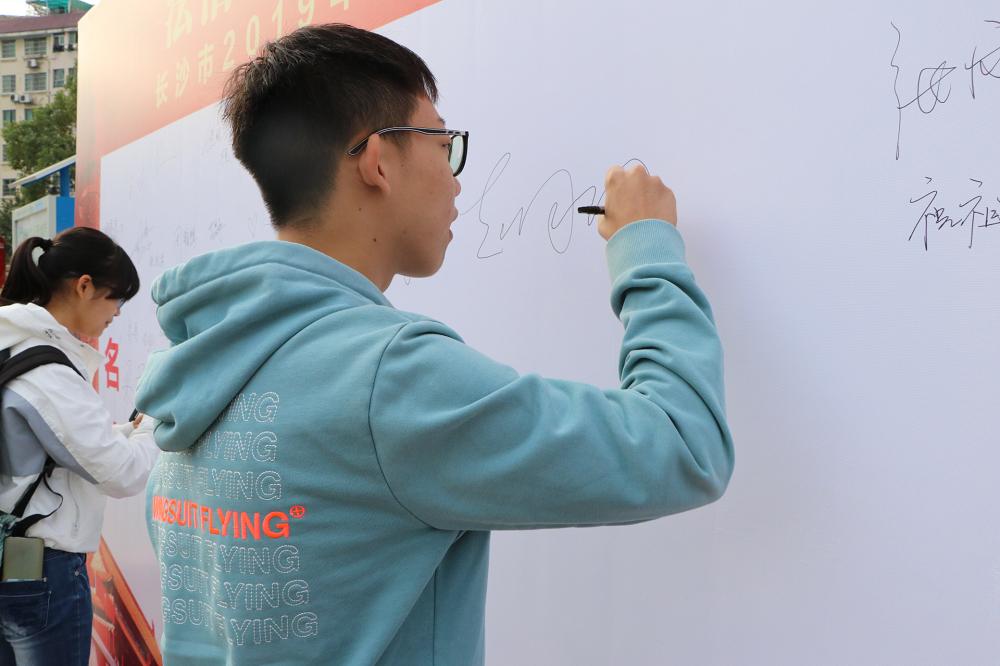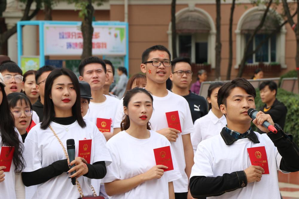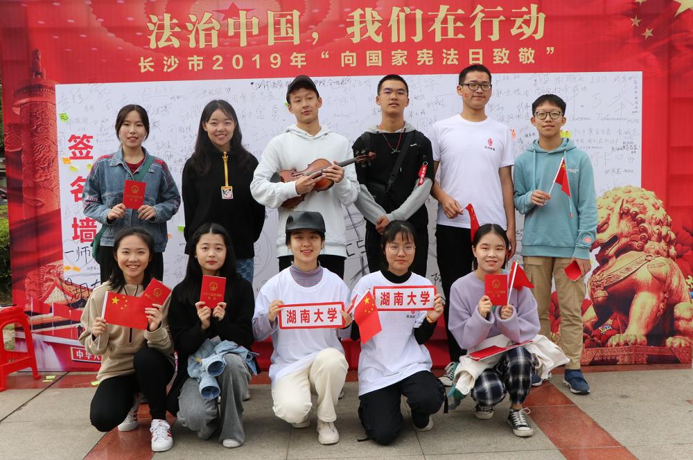 学生在长沙市咸嘉广场参加2019年度“祖国在我心中,宪法伴我一生”快闪活动。本次活动由长沙市司法局主办,岳麓区区校共建大学生法制联盟、长沙市岳麓区司法局、岳麓区咸嘉湖街道共同承办,各高校成员单位及咸嘉湖社区协办。