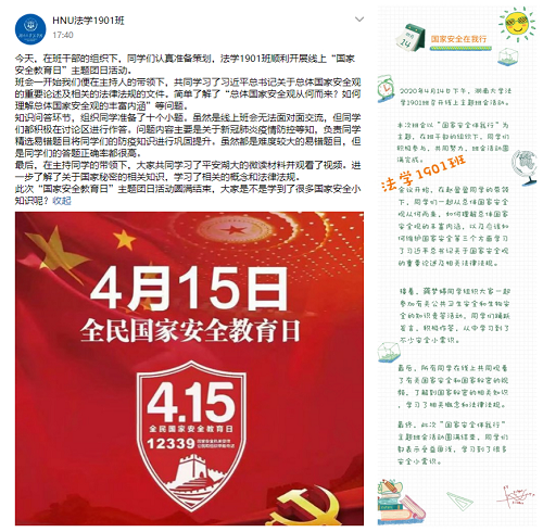法学1901班通过线上会议组织学习习近平总书记关于总体国家安全观的重要论述及相关法律法规,共同学习“平安湖大在线”微信平台中关于国家安全教育的系列内容并观看相关影视作品,据此进行在线讨论。除此之外,还结合当下新冠肺炎疫情防控形势,以知识竞答的方式,让同学们在轻松愉快的氛围中收获公共安全、生物安全等相关知识。