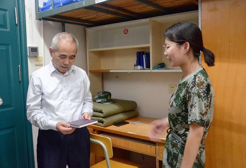 院领导先与迎新团队成员进行交流。仔细询问迎新的基本情况,听迎新团队成员分享迎新工作的体验与收获。在学生宿舍,学院领导与同学们进行了亲切交谈,询问仔细询问新生来自哪里、对大学生活是否适应、食堂饭菜是否合乎口味、对军训感受如何等。屈院长叮嘱大家,注意劳逸结合,即使军训结束,在学习之余也要加强锻炼身体,拥有一个健康的体魄对于顺利完成学业至关重要。他仔细查看新生书架上摆放的书籍,并与学生交流读书心得,勉励同学们要努力学习,踏实读书。