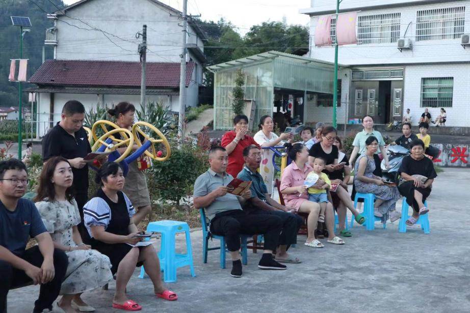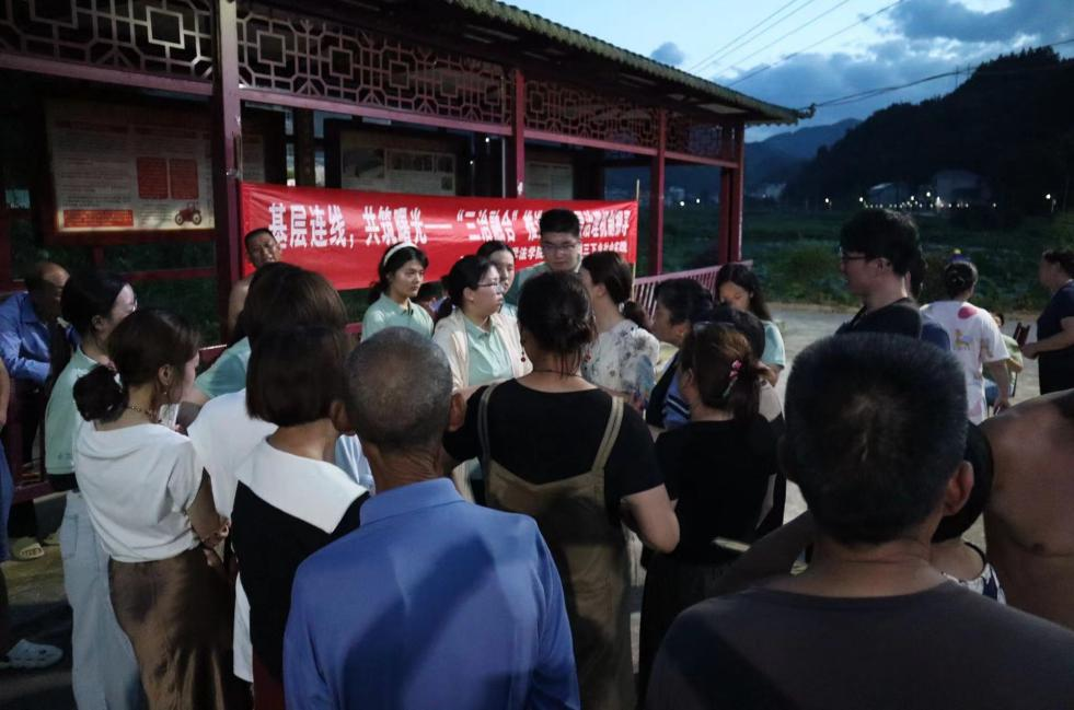 当晚,乡政府及村支两委组织村民积极参加“屋场会”。“屋场会”是笔峰村凝心聚力的法宝,源自于湖南乡村在“祠堂”进行宗族议事的传统习俗,不设大讲台、大喇叭,与村民面对面、心贴心。团队成员针对笔峰村村民关心的土地纠纷、婚姻家庭与继承、电信诈骗、未成年人保护等法律问题结合实际案例进行普法宣传,并与村民友好互动及亲切交流,让法律生根发芽,让法治深入人心。