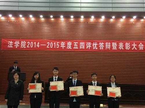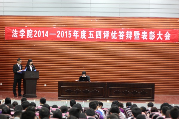 2014—2015年度五四评优答辩暨表彰大会在学院报告厅隆重举行。学院党委副书记、副院长付蓉芬、2014级法学三班班主任张秋航老师、教务办雷秋玲老师、党务与学生工作办公室主任杨锦滔、分团委书记刘岳峰、辅导员王耿翔、分团委常务副书记、辅导员杨凯,2014级班主任汪洋、丁亚琦、动漫色情片