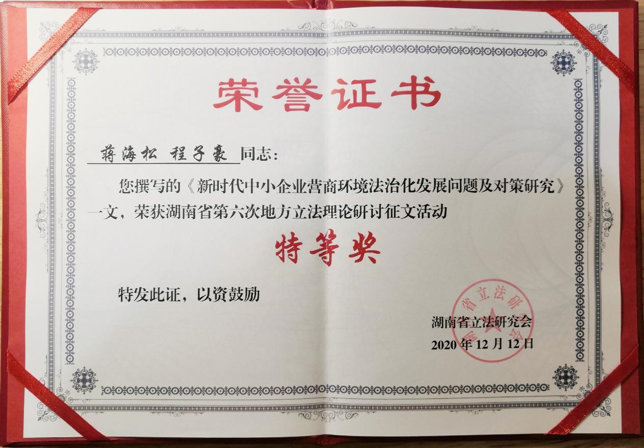 教师、省人大立法咨询专家蒋海松副教授与指导的硕士生、2020级法律硕士研究生程子豪合著论文《新时代中小企业营商环境法治化发展问题及对策研究》荣获本次研讨会论文最高奖“特等奖“。程子豪同学在研讨会的”促进中小企业发展“专题模块做了相关主题的学术报告。论文和报告阐述了目前中小企业营商环境所面临的法治问题并提出了对策与建议,获得相关领导和立法专家的认可。