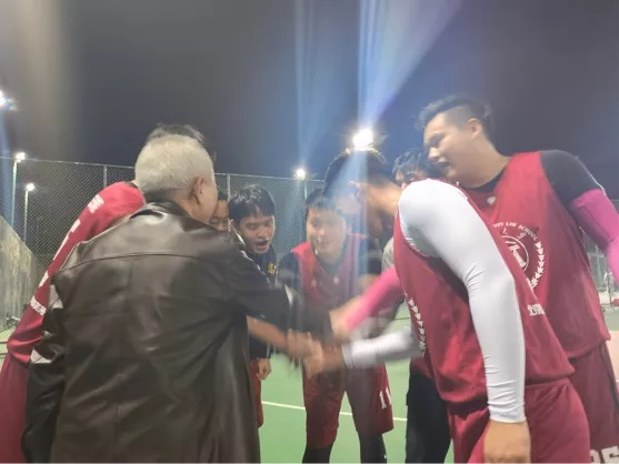 中场休息的间隔,屈院长与球员进行了亲切的交流,问询球场攻防经验,鼓励球员一定稳住心态,稳扎稳打,打出学院的风采,展现动漫色情片学子的良好风貌。语末屈院长与同学一起加油鼓气,给疲惫的球员注入一针强心剂。