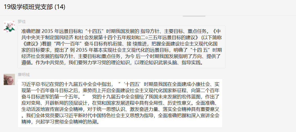 2019级法学硕士党支部于2020年12月27日在线上召开了“学习十九届五中全会会议内容”的线上学习探讨活动。本次会议由2019级法学硕士党支部书记张鑫主持,支部内各党员参加了此次会议。