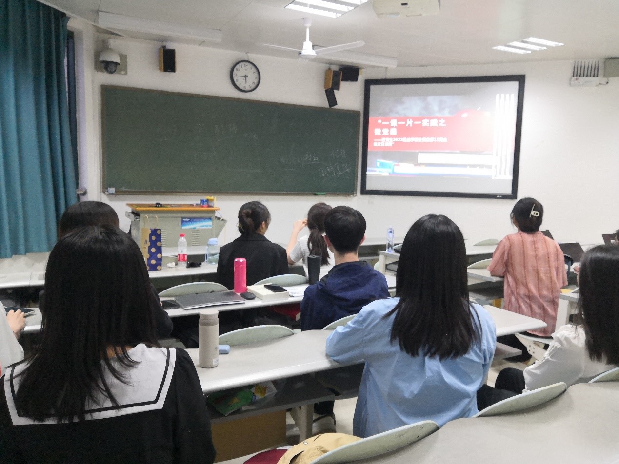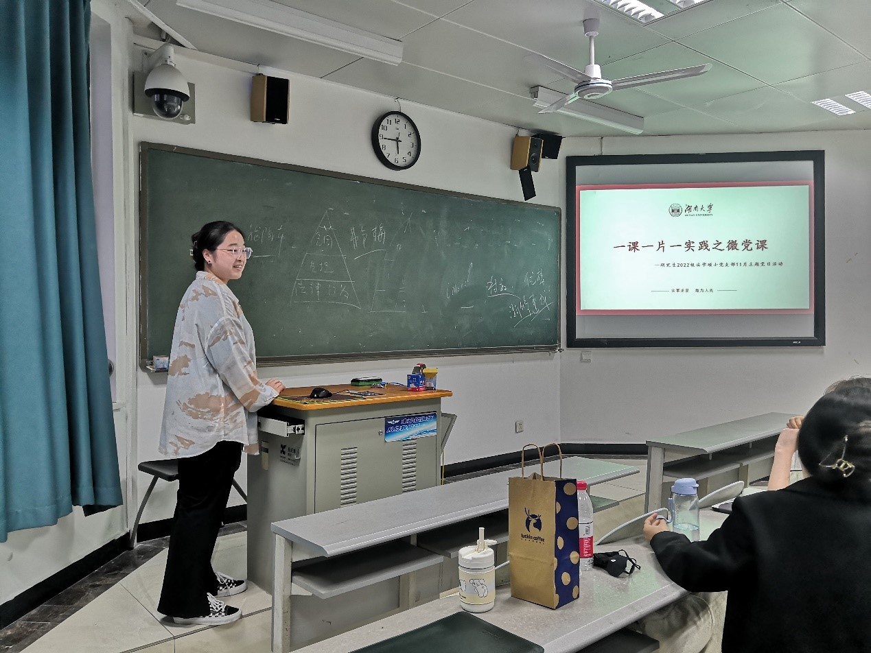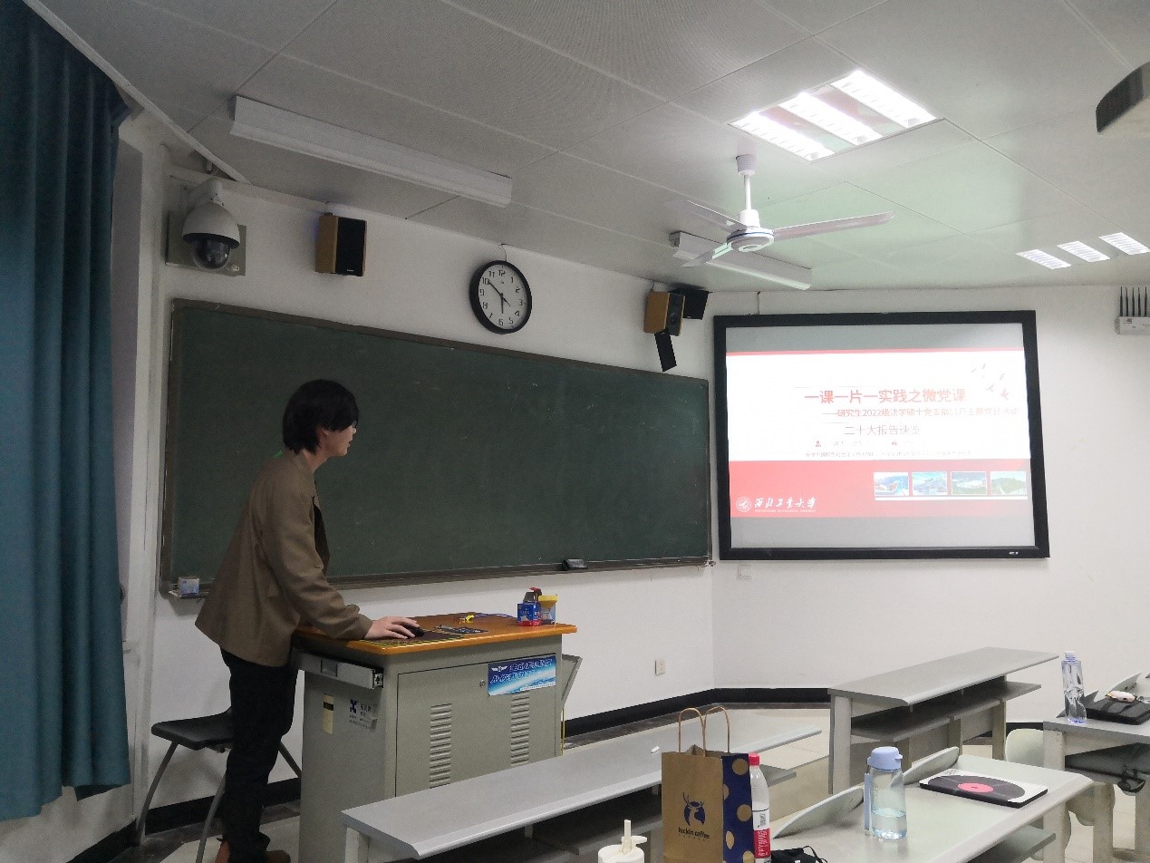 研究生2022级法学硕士党支部于11月10日下午在水教开展党支部主题党日活动。此次党日活动聚焦“一课一片一实践”活动主题紧紧围绕党的二十大开展,以党的二十大报告和新修订的《中国共产党章程》为主要内容进行学习。本支部通过组织党员上台讲“微党课”的方式开展此次党日活动。本支部全体成员参与此次活动。