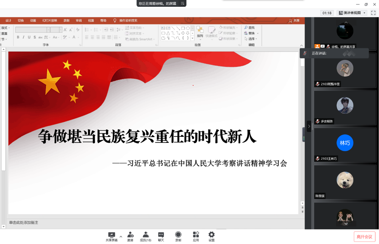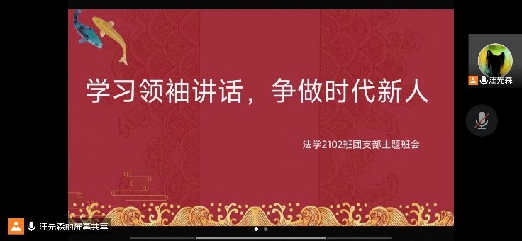 法学2105班于2022年4月28日晚上在腾讯会议平台上开展了以“勇担时代使命,锤炼过硬本领”为主题的线上团员学习交流活动。本次活动由团支书靳高策主持,全体团员参会。