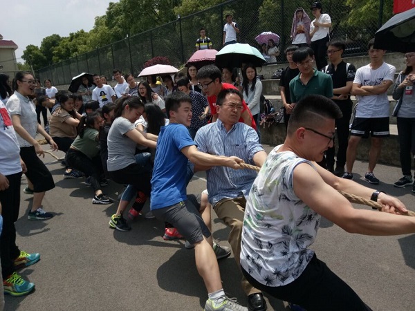 第二届群众体育文化节开幕。参加本次拔河比赛的队伍共有14支,每个队伍中都有一至两位老师参与其中。