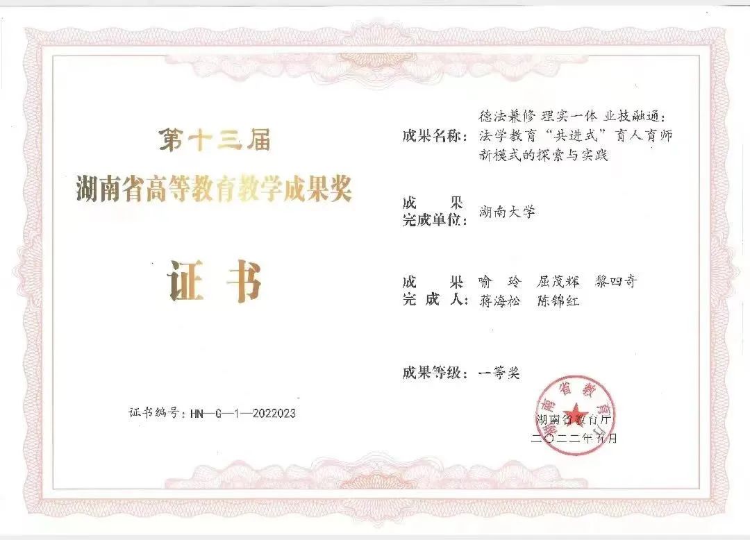 共两项成果获奖。其中,喻玲教授团队开展的“德法兼修 理实一体 业技融通:法学教育‘共进式’育人育师新模式的探索与实践”项目与屈茂辉教授团队开展的“对接·融合·保障:法律专业硕士培养体系创新与实践”项目分别喜获省级一等奖和省级二等奖。