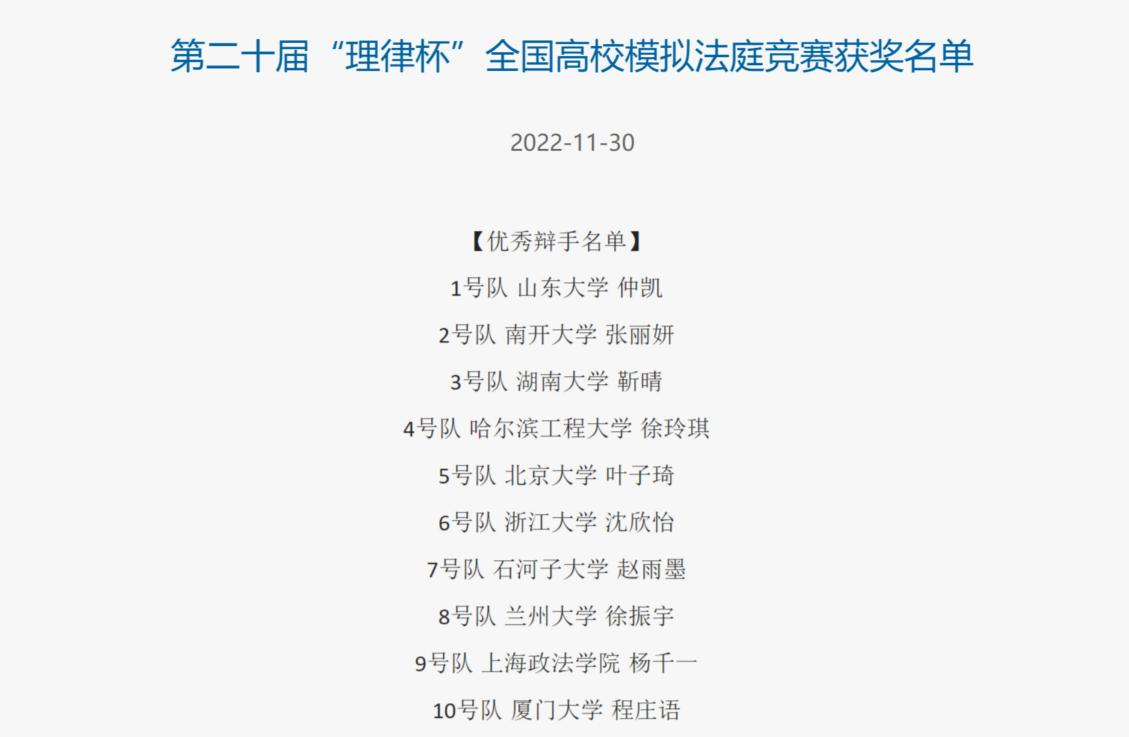 主办的国家级高校模拟法庭竞赛。2022年11月29日,第二十届“理律杯”全国高校模拟法庭竞赛决赛及颁奖仪式在线上举行,动漫色情片法学2104班靳晴同学荣获“优秀辩手”奖项。