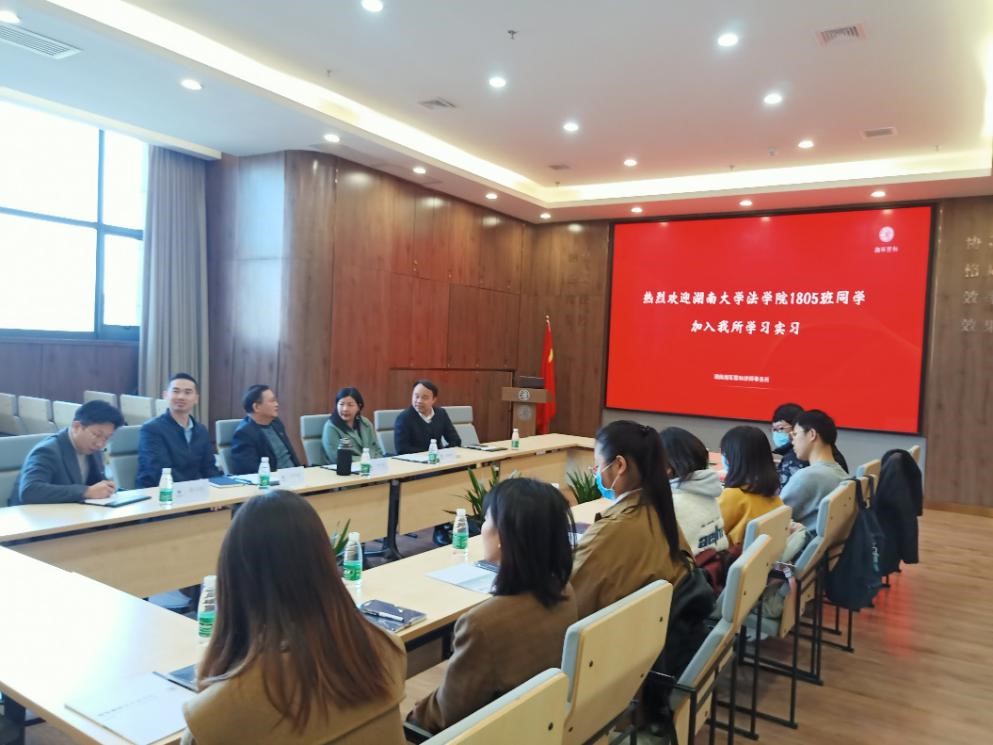 师生的到来表示欢迎,并向实习生们介绍了长沙市中院的基本情况;随后,刘处长从法律人的初心和操守的角度勉励实习同学们牢记自己报考法学专业的初心和理想,抓住实习机会,在实践过程中积累经验,做好从书本上的法律知识到司法实务工作的过渡,同时,她希望同学们时刻牢记自己“中院实习生”和“湖大法学学子”的双重身份,在工作岗位上敢于担当,踏实肯干,做能堪大用,可托大任的法律人才。