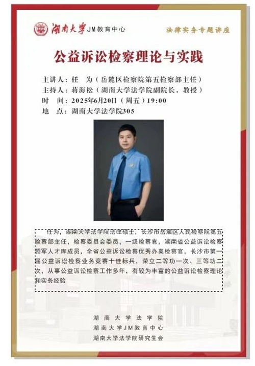 任为检察官系统阐释了检察公益诉讼的理论框架与司法实务经验,结合亲历的典型案例深入剖析制度内核。通过理论体系构建与实务场景还原相结合的方式,为同学们带来一场兼具学术前瞻性与实践指导性的专业授课,旨在提升法学专业学生的实务应用能力,深化对中国特色公益诉讼制度的体系化认知。