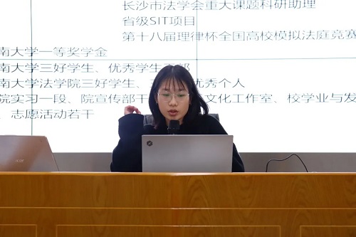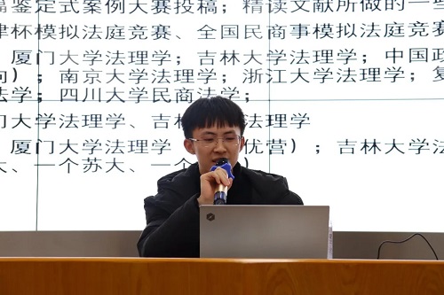 “长风破浪会有时,直挂云帆济沧海。”这是保研至武汉大学民事诉讼法方向的苏靖雯给同学们的寄语。此次交流会中,她主要从保研准备和参营经历两方面进行分享。结合自己的保研经历,她向同学们详细罗列大学各阶段需要准备的材料,同时提醒同学们注重专业课学习、论文和专著阅读。她提醒同学们,只有提高个人实力,才能在参加夏令营与其他高校优秀学生同台竞争时脱颖而出。
