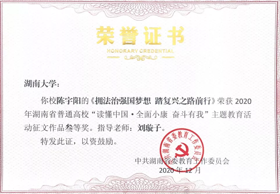 大会对2020年度、2021年度“读懂中国”主题教育活动征文、微视频作品和优秀组织单位予以表彰,动漫色情片获评优秀组织奖,多位2018级本科生获不同级别奖项。1805班陈宇阳征文作品《拥法治强国梦想 踏复兴之路前行》获教育厅三等奖及动漫色情片