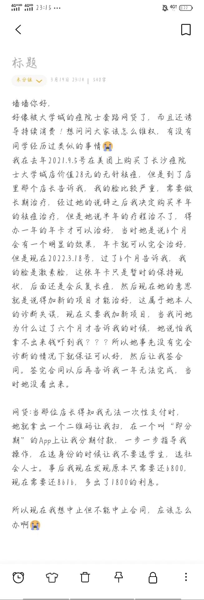 事件起于2021年9月5日,当事同学在美团上购买了长沙痘院士大学城店价值28元的无针祛痘,但到线下店中,被店长告知,脸比较严重需要长期治疗。当事同学遂听取店长的说辞,决定购买半年的祛痘治疗项目。随后,店长又表示,6个月的治疗会有个明显的结果,但无法根治,需要办理年卡才能够完全治好。6个月后至2022年3月18日,当事同学又被店长告知,她的脸属于激素脸,年卡只能够暂时保持现状,后期会反复长痘,需要增加新项目。面对当事同学“为什么过了6个月才告知”的质疑,店长解释道:是害怕当事同学会因诊断受到惊吓且担心当事同学无法足额付款。过后,得知当事同学无法一次性支付费用时,店长提供了一个二维码供当事同学扫码并指导当事同学在“即分期”APP上分期付款,店长特别提醒当事同学选择“社会人士”身份,而非“学生”身份。事后,当事同学发现原本仅需偿还的6800元,增加至8616元,当她提出想要终止合同时,遭到店长拒绝。至此,当事同学发现受骗。