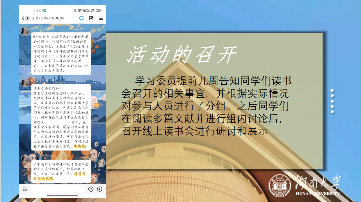 读书会由法学2102新生班导金博涵牵头,目的是帮助同学们打好行政法的学习基础。读书会主要围绕“从管理论、控权论到服务论、平衡论—中国行政法理论基础的论战”这一主题展开。从“管理论”、“控制权论”、“服务论”、“平衡论”四个方面,将班级同学划分为四个小组。小组成员分工合作,共同检索文献、共同研读、讨论得出小组所对应方面的支撑观点。活动以线上会议的方式开展,以小组辩论的形式论战。活动结束后,由金博涵进行点评和答疑。