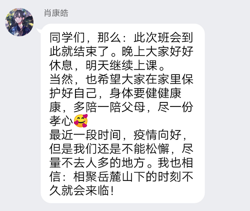 为普及疫情防控知识,增强抗疫必胜信心,引导同学们更加清晰地认识中国特色社会主义制度优势,强化疫情期间同学们的爱国主义精神,在班委的组织下,法学1803班开展线上主题班会。此次班会由疫情防控线上知识问答和理解习近平总书记的重要指示精神两个环节组成,法学1803班全体同学积极参加。