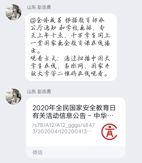 同学们集体线上观看国家安全直播课,对国家安全相关知识有了更加深入的了解。在观看直播课后,同学们在qq群中分享自己关于国家安全内容和重要性的理解,并根据当前国情和社会发展现状进行分析,阐述新时代增强国家安全意识和加强法治建设的必要性。随后,同学们结合此次新型冠状病毒疫情的情况,进一步举例阐述国家安全意识的重要性,同时根据个人的实际经历提出大学生在面临安全威胁时的处理方法和相关建议。
