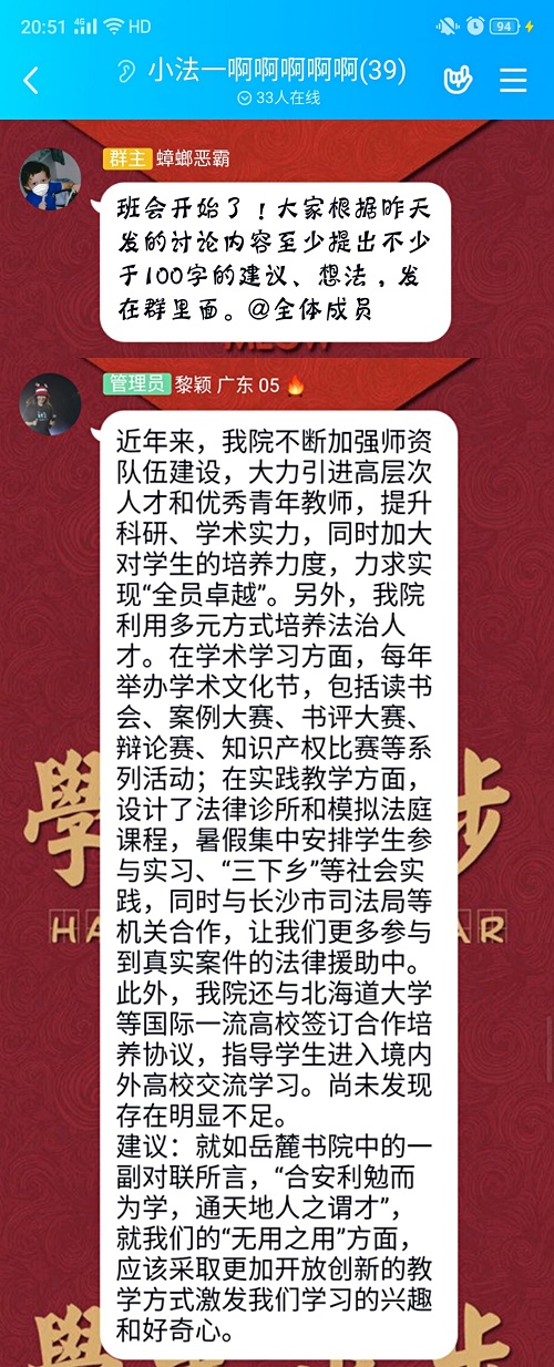为积极响应落实人才培养中心地位大讨论活动的号召,凝聚师生智慧,进一步营造人人关心、人人参与的氛围,法学1801班于5月10日晚举行了线上班会,同学们积极参与讨论,纷纷建言献策。