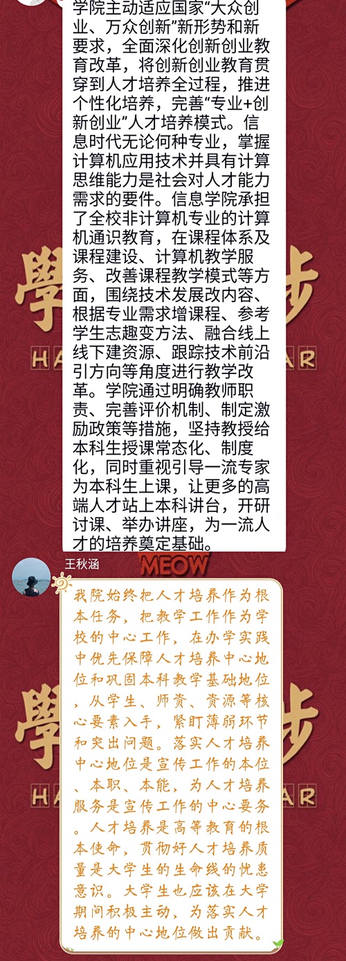 在此次讨论活动中,同学们对学校、学院的人才培养工作进行了回顾、给予了评价,也对下一步的“落实人才培养中心地位”工作提出了建议,并讨论了学生党员及辅导员实际行动层面的问题。希望同学们的意见与建议能够帮助学院、学校将人才培养计划落实得更为广泛、更为彻底!